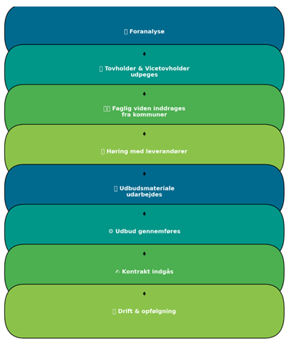 - Redskaber: Standardiserede skabeloner, vejledninger og kontrakter sikrer en effektiv proces.